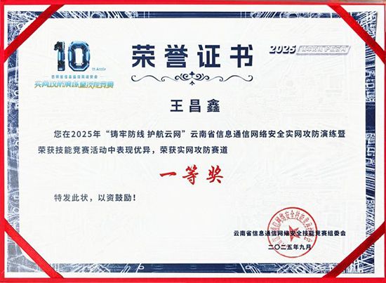 在刚刚落幕的由云南省通信管理局、云南省公安厅、云南省工业和信息化厅联合主办的“铸牢防线 护航云网”实网攻防演练暨技能竞赛中,我校计算机与智能技术学院2024级计算机科学与技术专业王昌鑫同学,凭借扎实的专业功底和出色的实战能力,以超高的实网得分夺得学生组实网攻防赛道一等奖,这也是本赛道学生组全省唯一的一等奖。