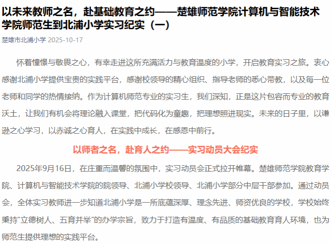 【转载】以未来教师之名,赴基础教育之约——楚雄师范学院计算机与智能技术学院师范生到北浦小学实习纪实(一)
