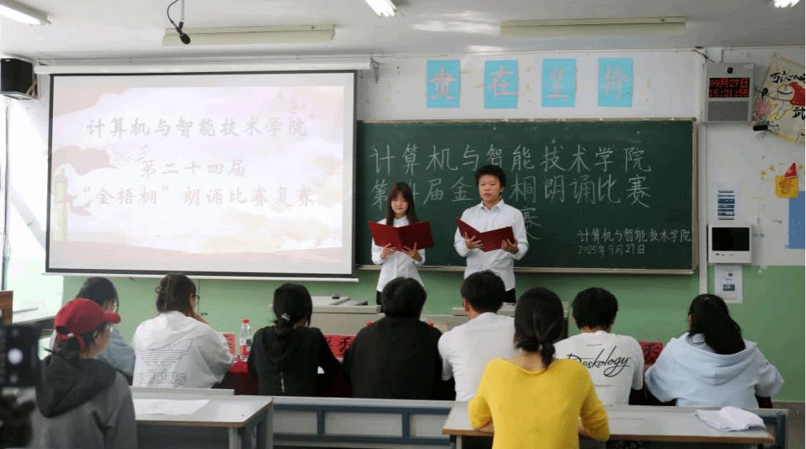 本届“金梧桐”朗诵比赛的成功举办,不仅是一场语言的盛宴,更是一堂生动的思想政治课。充分展现了新时代青年与党同心、与党同行的精神风貌。计算机与智能技术学院将持续弘扬爱国精神,传承中华优秀传统文化,为中华优秀语言文化的传承发展注入时代新动能,使文化根脉在新时代绽放出更为绚丽的光彩。