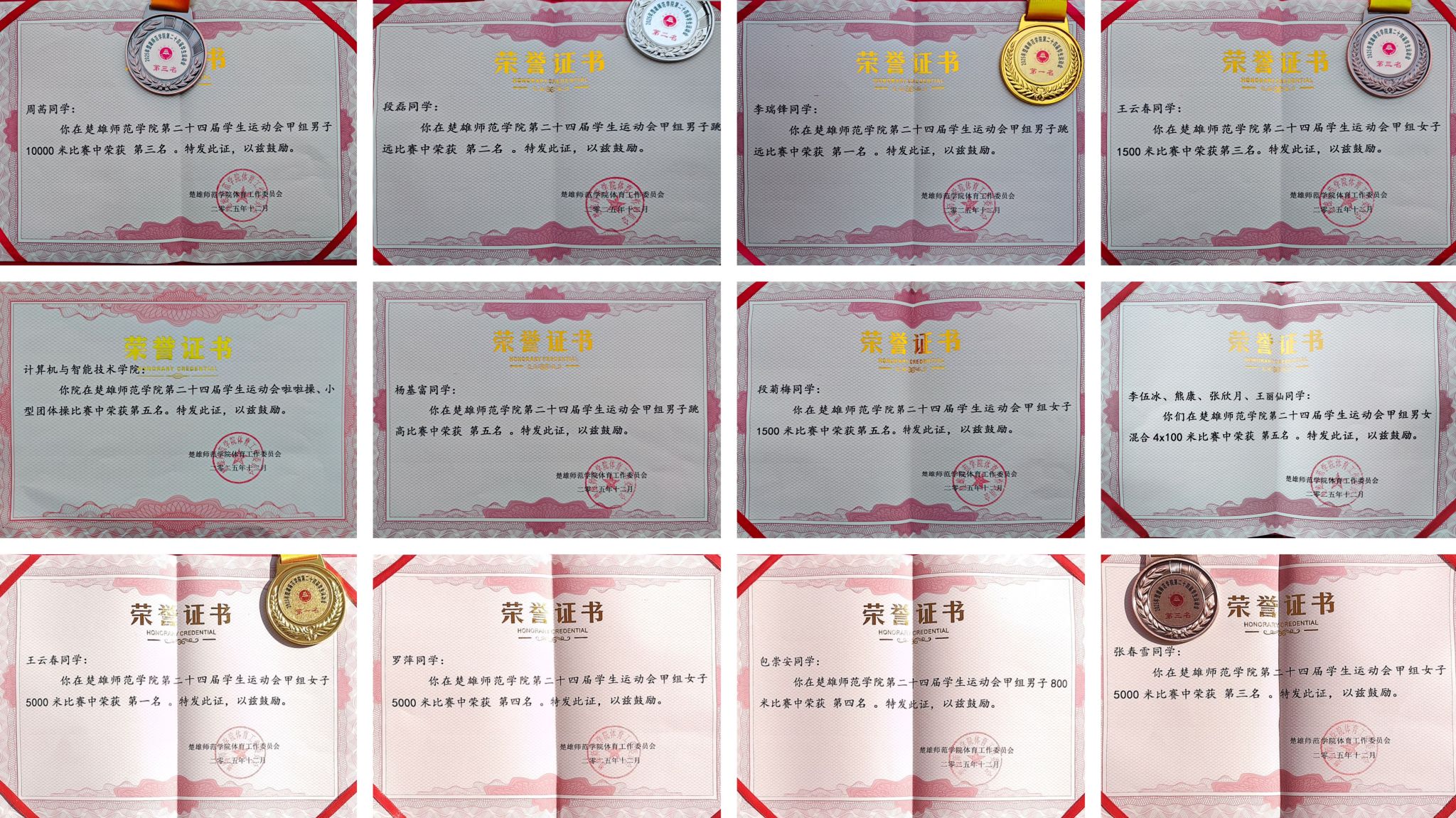 三天的汗水与拼搏,谱写了一曲青春的赞歌。我院在团体操、啦啦操两项集体项目中荣获第五名;2025级数媒(三校生)班李瑞峰、2023级人工智能班段磊分别斩获男子组跳远项目的第一名及第二名,2023级网络工程班王云春勇夺女子组5000米比赛第一名及女子1500米比赛第三名,2025级计算机科学与技术班周茜赢得男子组10000米长跑比赛第三名。我院运动健儿在各项目中表现卓越,每一张证书都闪耀着拼搏的光芒。最终,我院获得学校第二十四届运动会团体总分第五名。